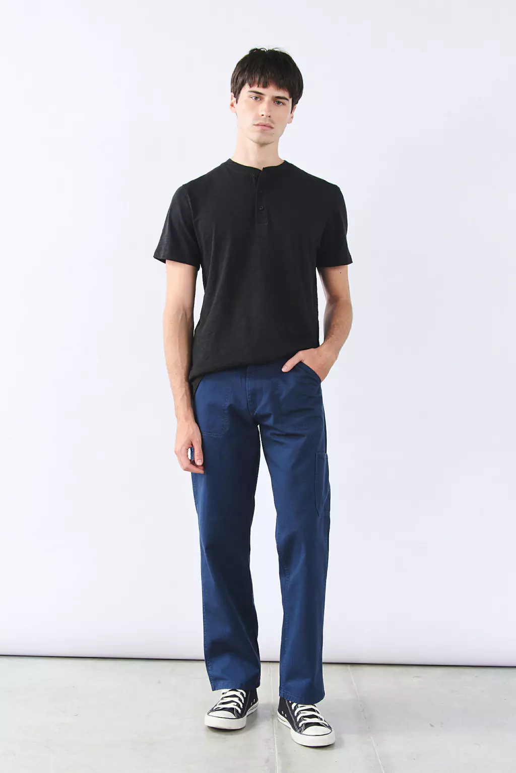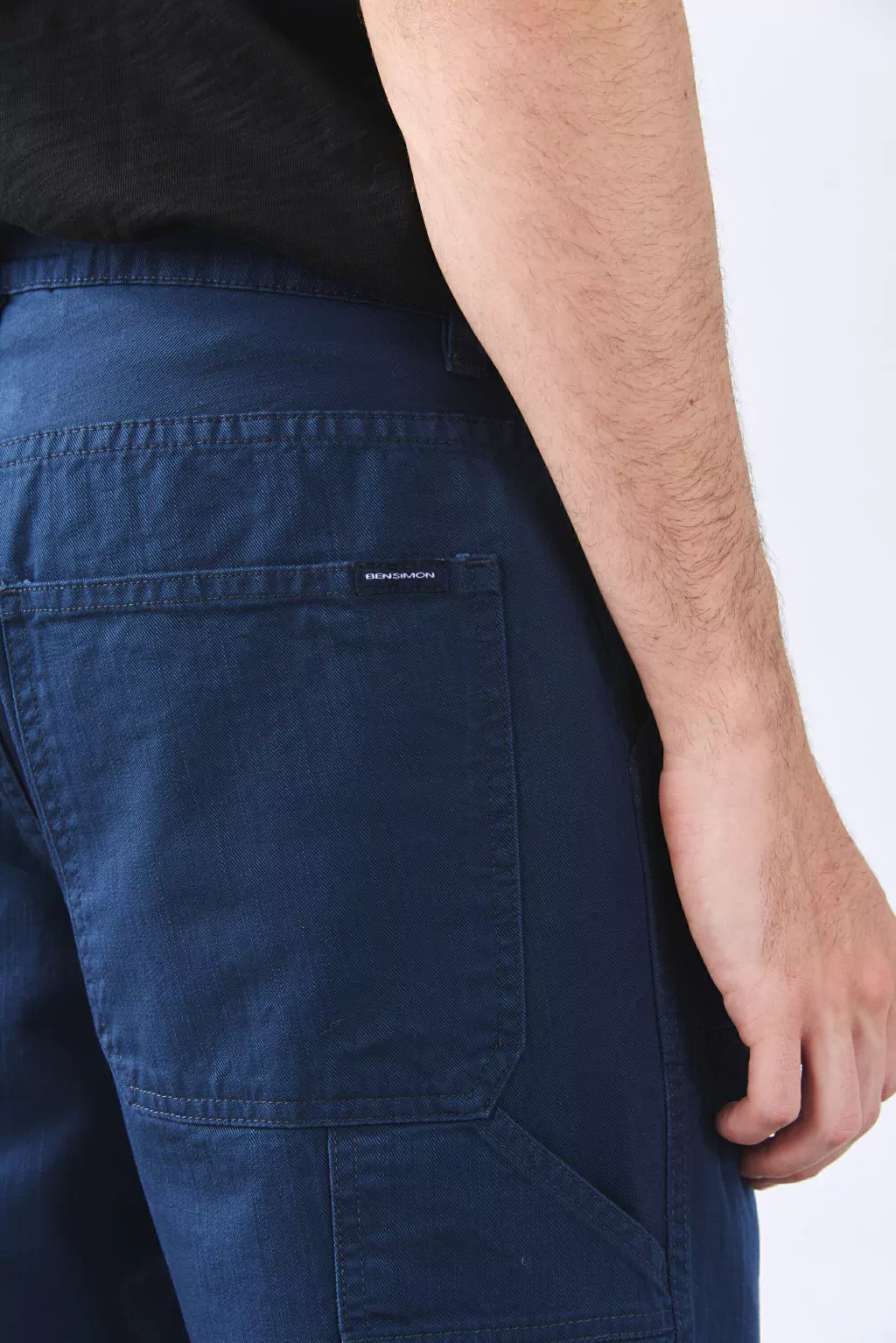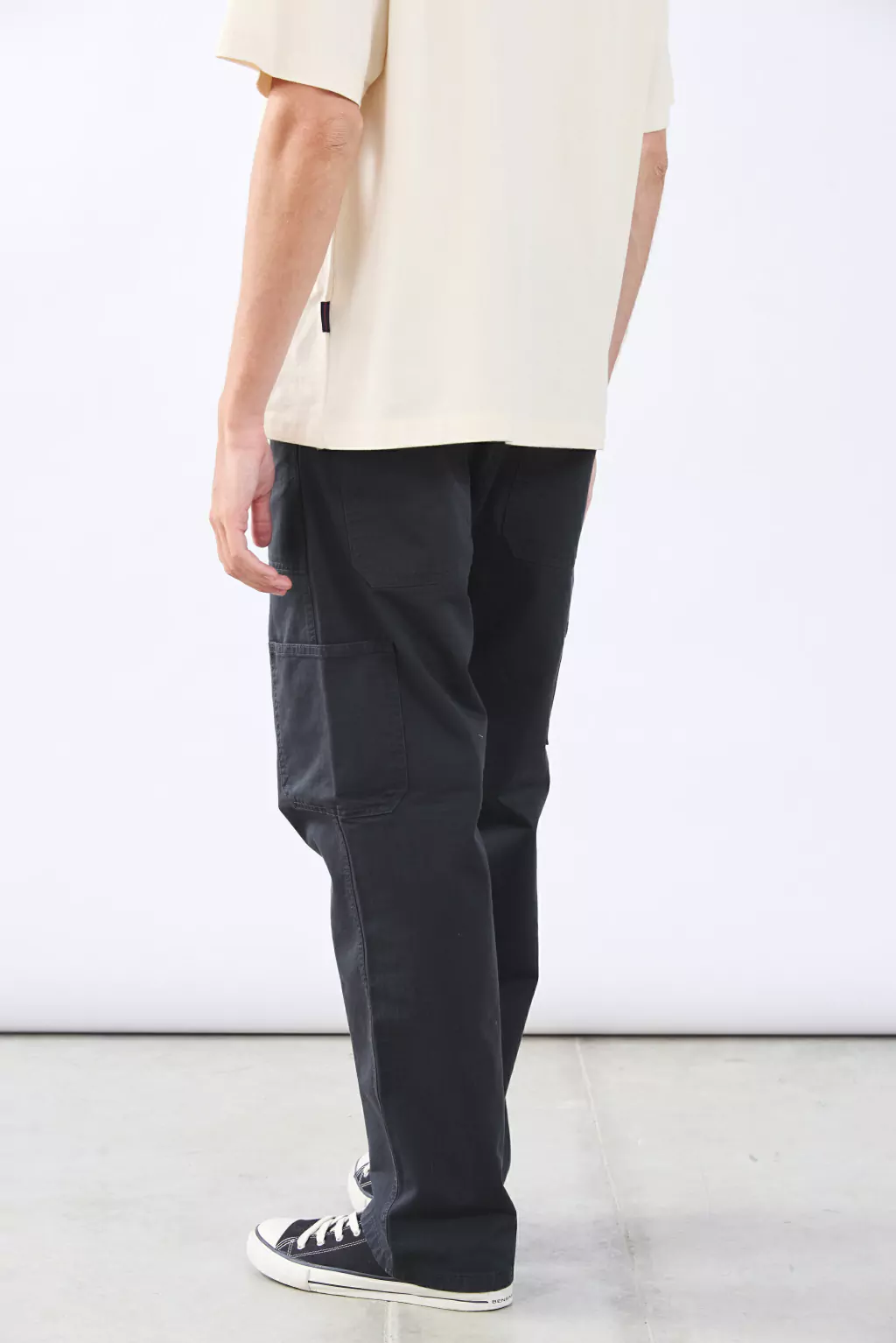 Pantalón construcción jean cinco bolsillos de corte relajado, con detalle de bolsillos aplicados en piernas. Cierre en cartera y botón metálico en cintura. Confeccionado en Gabardina con trama flama.
